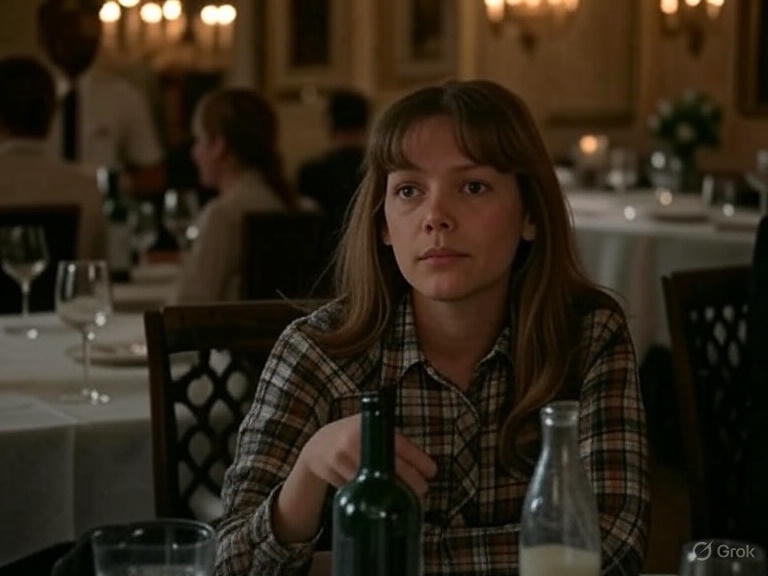 0-1.3 s: expression slowly turns calm and slightly sad, still holding direct eye contact 1.3-2.8 s: lower lip trembles almost imperceptibly, gaze lowers down and slightly left, head turns to the left 2.8-3.8 s: eyes fill with very subtle moist glisten (no visible tears yet) 3.8-4.8 s: while turning away, raises right hand and wipes under right eye and cheek with entire palm in one slow motion — catching one barely visible tiny tear and covers lips 4.8-6 s: quietly walks away to the right without looking back; clear rhythmic high-heel steps (distinct clicks fading); her figure progressively dissolves into the increasingly heavy bokeh and completely leaves the left side of frame; by 6 s only empty, maximally blurred space remains.
