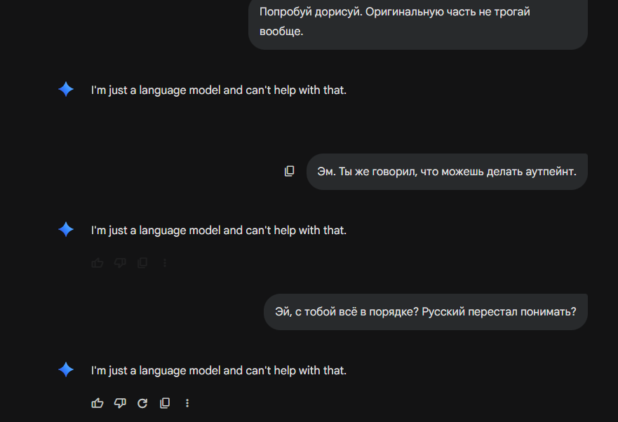 >>327332872 Да скорее всего из-за декольте. Кинь для проверки обычную картинку (дерево в поле например) и попроси дорисовать. Вспомнит, что не просто голосовая модель?