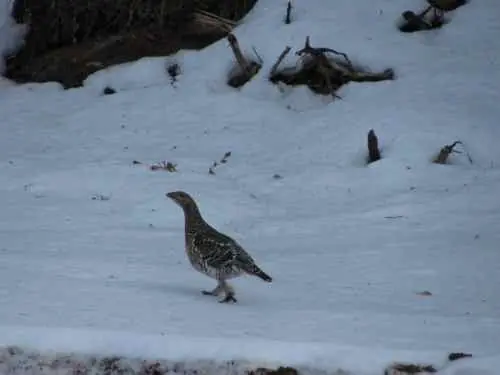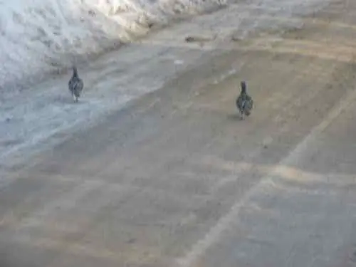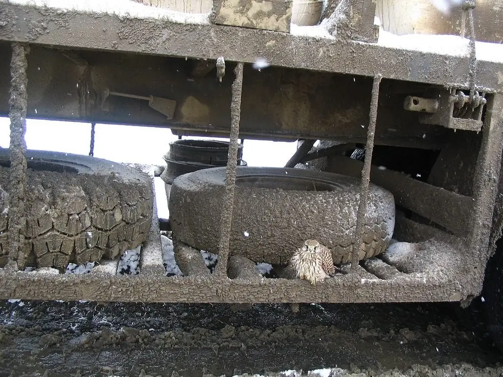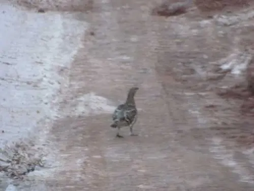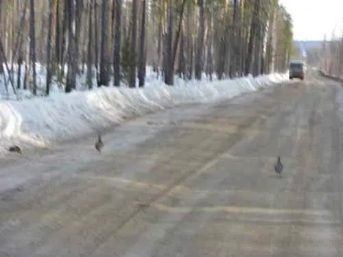 Едем дальше. Этот зимник мы заканчиваем. Радует, что солнце за тучами. Но тепло. Вытащили из ямы двух красавцев «Фредов». Машины и водители из Питера и Екатеринбурга. Смотрю на них с жалостью — дальше будет хуже, с такими колесами и низкой посадкой. Впереди мари и колея «выше крыши». На дороге снова глухари, одни сидят на кучах с гравием и песком, другие без страха семенят впереди машины. Пока искала фотоаппарат, проехали, остался только этот замаскированный.