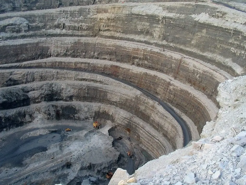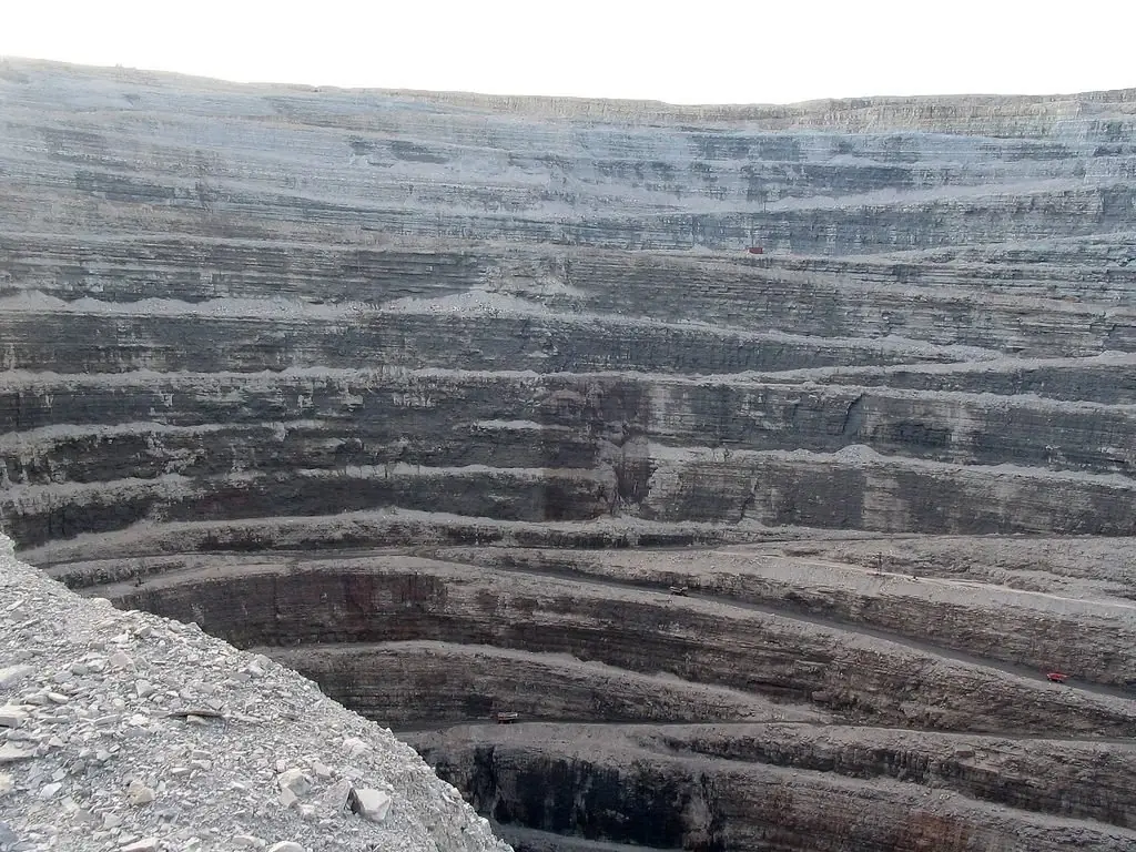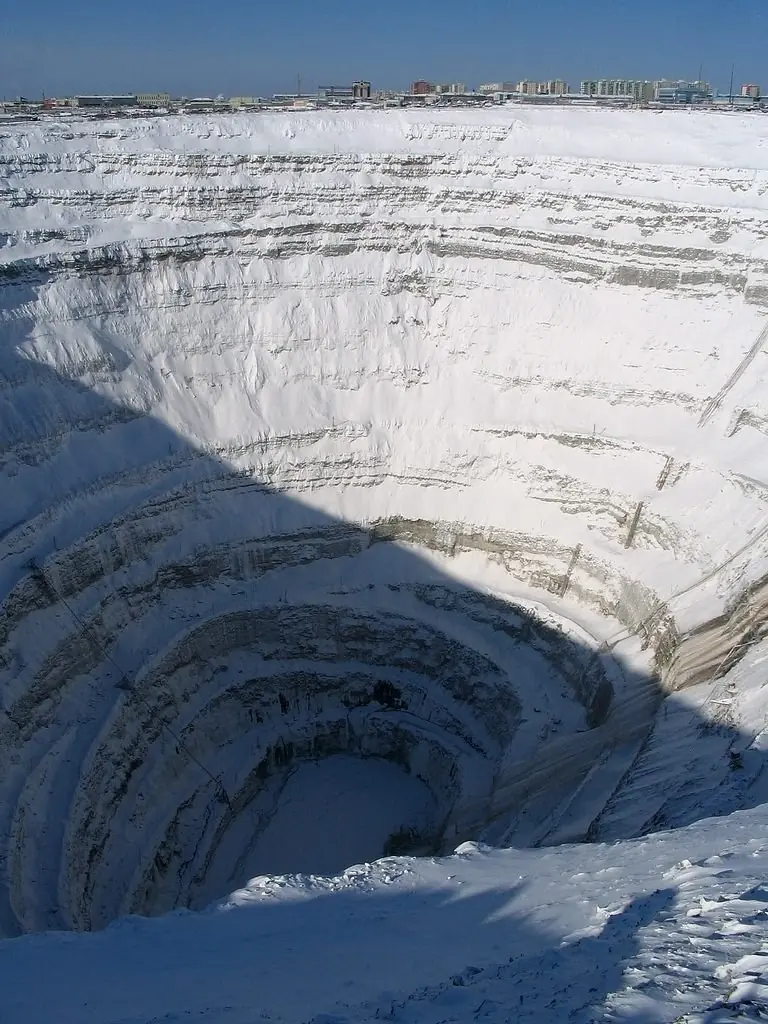 Для защиты от камнепада стенки карьера прикрыты металлической сеткой. Город Мирный своим рождением обязан открытию кимберлитовой трубки «Мир» в 1955 г. Карьер «Мир». Закрыт в 2001 году. Глубина 525 м., ширина более 1200 м. Это не город вдали, а карьер такой большой! Если все дома со всеми постройками и бибиками сложить в «яму», наверное, и четвертую часть не заполнит. Сейчас алмазы добывают закрытым способом, в шахте.