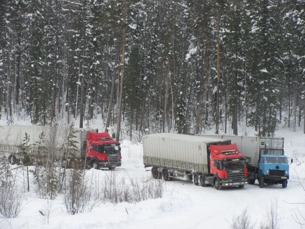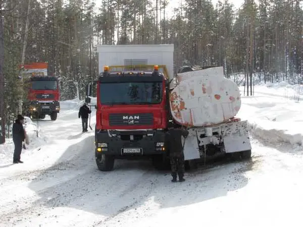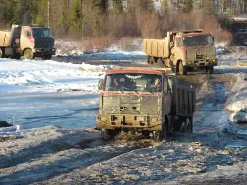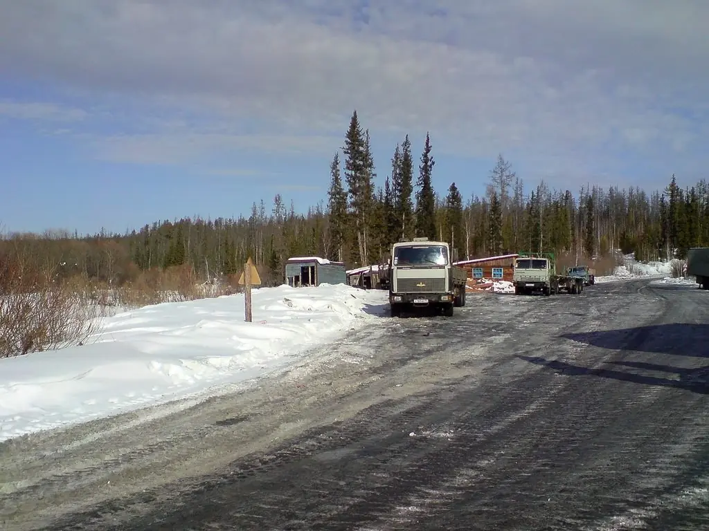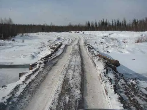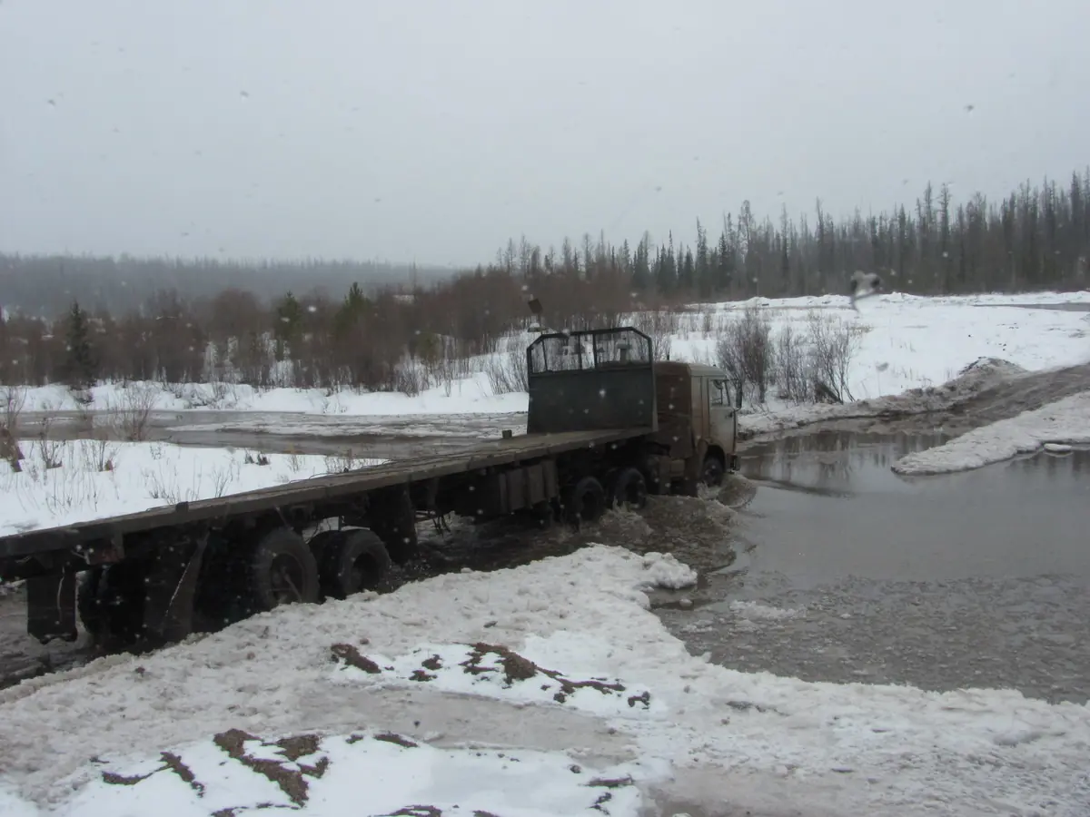 Лесные речушки. На вид речки невзрачные, неприметные. Если появилась вода, кажется небольшая наледь. Где-то поставлены вешки на переезде, где-то их вовсе нет. Именно в таком месте у нас однажды от удара об лед сломалась балка на фуре. Нельзя относиться с пренебрежением к таким переправам. Хотя переезды дорожниками укреплены, но речки умудряются даже среди зимы вскрываться, образую огромные наледи, собирая сотни машин с обеих сторон. Груза в последнее время возят до 60-70 тонн. Весной идем по воде с осторожностью, провалиться можно до двух и более метров. И не дай Бог в конце зимника оказаться в дороге между вскрывшимися речками, тогда, как говорят водители: «Все, вилы!» Одна надежда на дорожников.