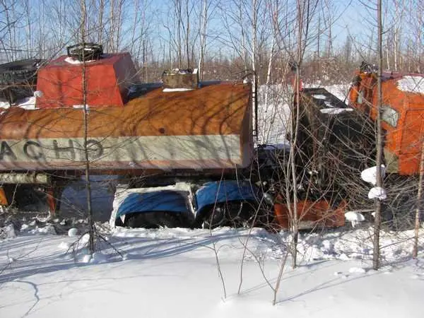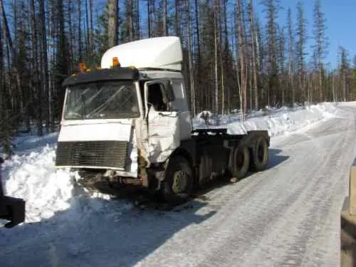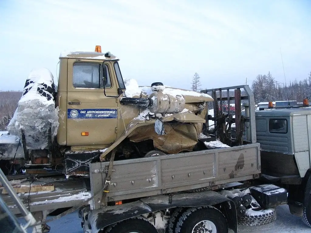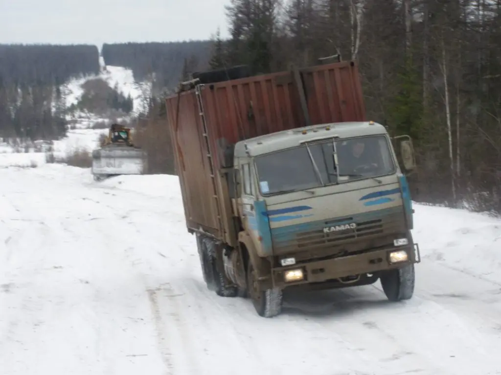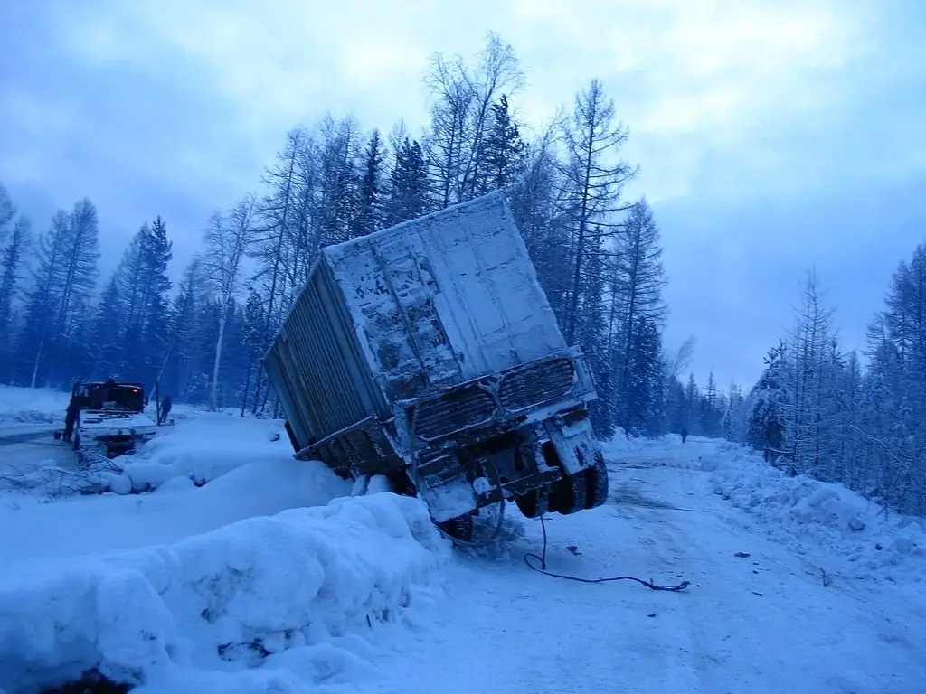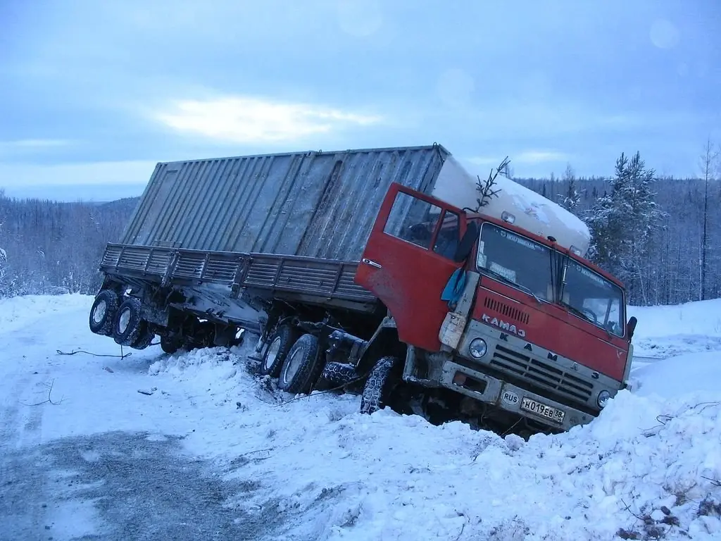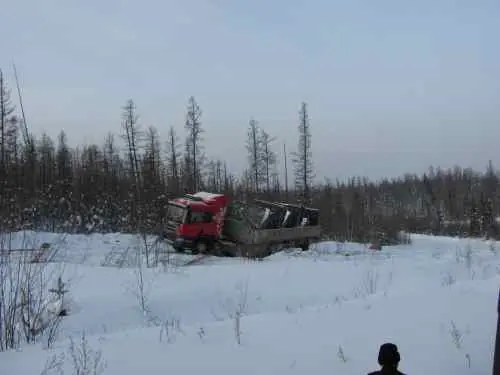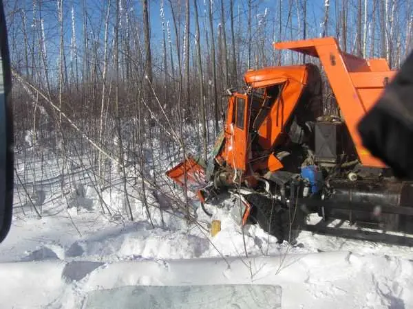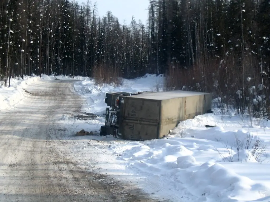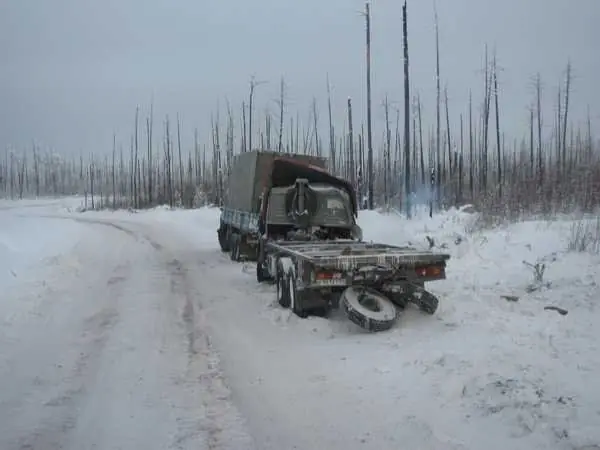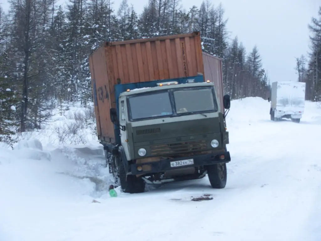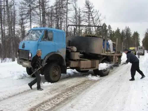 Не люблю в гололед подъемы. Если машина «шлифанула», то все — противооткатники, подсыпка, долбежка льда. Еще хуже, когда неуправляемо и с нарастающей скоростью тащит назад. Как-то на подъеме (кто ездит на Мирный, знает) в 90 км от выхода с зимника, лежит упавшая металлическая конструкция, почему-то называемая фермой. Там часто «канитель». Поднимаемся. Одна фура уже стоит в стороне, уперлась в деревья. Вокруг все изрыто. Водитель с напарником на все плюнули, ужинают, а может, уже завтракают. Две другие машины, тоже с фурами, штурмуют подъем. И мы тут нарисовались. Муж с лопатой и ведром пошел помогать. Сверху спускается пятая машина, с фурой! Да, что б вас! Хотя и старается не сорваться, и спускается не быстро, но фуру заломило и он всей массой надвигается на нашу кабину. Сигналю фарами («бибикалка», как всегда, не работает) и лихорадочно ищу аппаратуру, чтобы запечатлеть драматический момент. А товар-то как жалко! Опять долги?! Про себя забыла. В последний момент, машина выровняла фуру в метрах трех от нас. И ушла с правой стороны. А мне влетело от мужа, орал: «В таких случаях прыгай назад, в спальник!». Щ-щас! Нашел кузнечика! Там все и как всегда забито вещами. Утром нас вытащил МАЗ, почему-то называемый «Чипс». У нас на БАМе, «Магирусы» называли «Чебурашками» и «Горбачами», может, и здесь так же. А вещи после того случая утром перекочевали под прицеп.