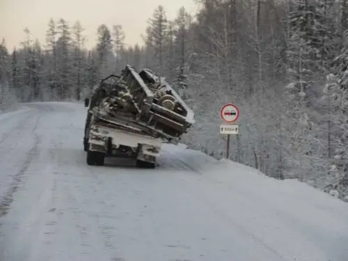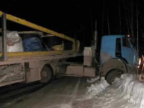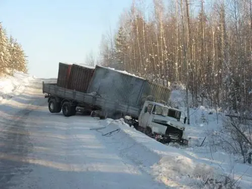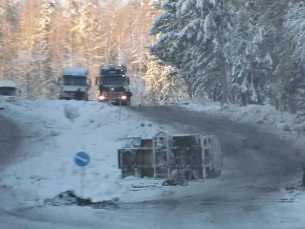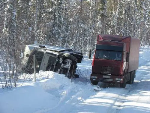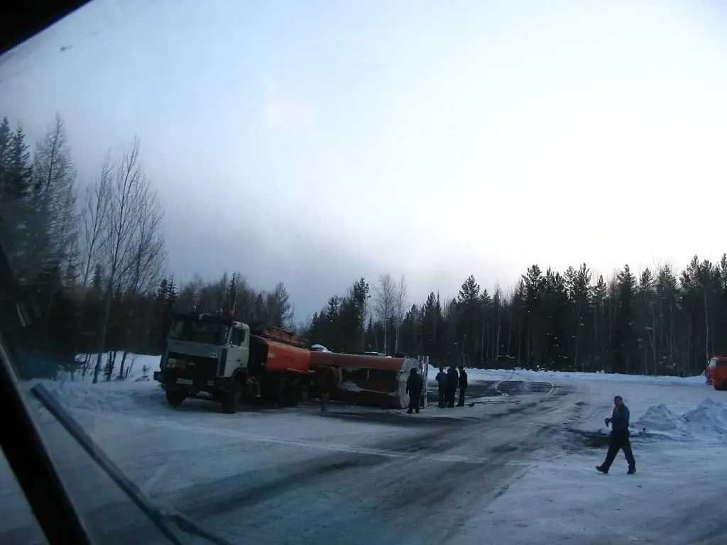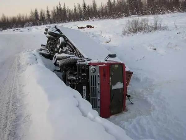 Главное, когда выбрасывает с дороги, — не было бы деревьев. Каждый год машины и люди страдают именно из-за таких встреч. Ночью за Нижней Тунгуской, за пикетом видим машину, которая кабиной «обхватила» ствол огромного дерева. Настроение упало. Едем, молчим, перед глазами искореженная кабина. В один голос начинаем удивляться мощности удара, жалеем водителя, который явно погиб. Но, к счастью, он оказался жив. Я знаю, что такое происходит за секунды. Как машину складывает на спусках или подъемах. Как-то на спуске перед рекой Малая Тира скопились машины. По прямой идти опасно, лед. По объездной дороге поднимаются машины 54-го региона. Все машины наверх затаскивает один водитель. Мужики из Азии (видно, везут фрукты) боятся. Водитель поднимет одну машины и возвращается за следующей. С мужем посмеялись, как они прошли марковскую дорогу. Мы не стали ждать, пошли прямо. Идем. Спиной чувствую, полуприцеп начинает трусливо подживать «хвост». Брызнул снег, по стеклу застучали ветки кустарников, почти рядом с кабиной подмигивают задние огни прицепа. Внизу выстроились горе-водители, наблюдают, что будет дальше. Кабины настежь. Нам в затылок «дышит» лесовоз с хлыстами. Если сорвется, мало никому не покажется. Муж орет, чтобы убрали с дороги машины. И естественно приперчив матом. Засуетились — одни сдали назад, другие продернули вперед, освобождая нам дорогу. Тормоза у лесовоза оказались хорошими, да и мы быстро выпрямились.