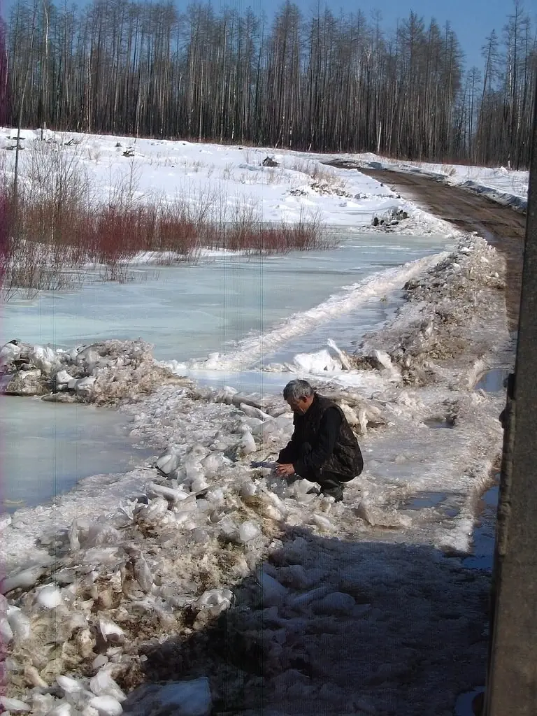 И еще: наледи, какие на зимнике бывают наледи! Это сущее наказание и огромная потеря времени, сотни скопившихся с обоих сторон машин! Адреналин и зрелище! Кто-то уже в наледях сидит и без посторонней помощи не сдвинется. У кого-то, пока проходил месило льда и воды, «поехал» груз или вовсе упал. А иной пытается вне очереди проскочить. Здесь недолго и до разборок. На пикете напарник водителя (или пассажир?) возбужденно рассказывал, как они легли на бок. Был очень рад тому, что все это время не прекращал снимать на видеокамеру. Что не радоваться, шли уже без груза и быстро подняли. Я тоже в машине иногда снимаю проход по наледям. В это время в машине летает все, что в принципе не должно летать. Видеокамеру, чтобы ни разбить лицо, прижимаю одной рукой к щеке, другой держусь. Муж грозится выкинуть « …эту чертову игрушку», и орет, что б держалась. Зато мои домашние — дети и внуки — знают, что такое наледи.