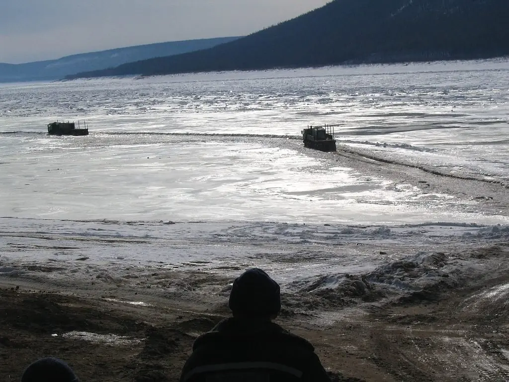 Как-то мои девочки-внучки два часа смотрели по телевизору праздничный концерт песен 70-80 годов, старшая сказала «Повезло вам, у вас были такие хорошие песни». Есть и сейчас много хороших исполнителей. Всю ночь играет на гитаре Дидюля. Бодрит. Днем ремонт, баня, спим. Но усталость накапливается. Прошли город Ленск. Рано утром у поселка Нюя вышли к реке Лена. На берегу столпились водители с грузом на нефтепровод. Машины из разных регионов. Люди в нерешительности — ехать в обход, или по реке. По реке ближе, но дорога в воде. В обход — подъемы и перекосы, плюс гололед, на некоторый участках — дорога в одну колею. Весной разъехаться почти нереально. Спустилась к реке первая машина. Одна за другой, соблюдая дистанцию для безопасности, оставляя за собой волны, по Лене медленно уходят большегрузы. Страшновато…