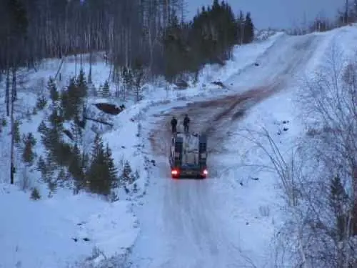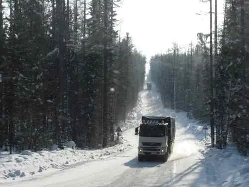 На некоторый подъемах, машины с грузом затаскивает трактор.
