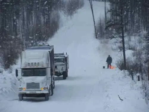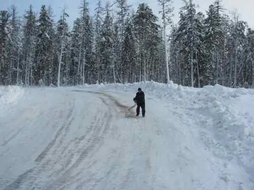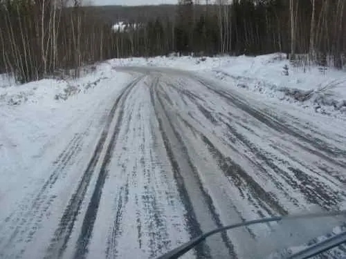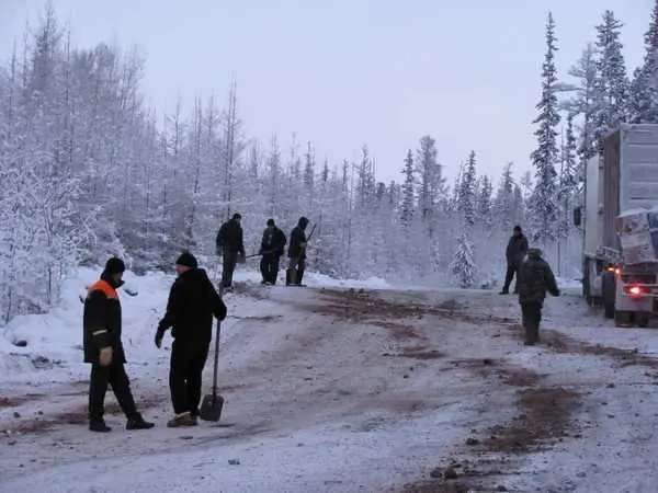 Гололед. Водители отсыпают подъем. Дорожникам спасибо, на всех сложных подъемах есть подсыпка. Раньше такого не было, подсыпка появлялась от случая к случаю, хватало ненадолго. Снегу не прикажешь не идти. Правда, и машин на зимнике было гораздо меньше. Многие и сейчас возят с собой шлак или гравий, так, на всякий случай. Выручает.