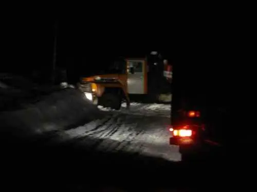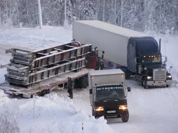 Уронили конструкцию. Скопились машины. Кто-то советует, надо ждать трактор. Долго же придется ждать! Другие, что конструкцию и машину надо спихнуть чертовой бабушке в обочину. Так делают у них, где-то в тундре. Где морозы за 60 и речь идет о выживании, наверное, другого пути нет. Но, слава Богу, здесь не тундра. Выход всегда найдется! Хорошо, на этом участке нет грейдера. Народ, вахтовики и водители, начали расчищать проезд сбоку. Рассвело и колонны тронулись