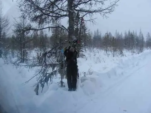 180 км до выхода из зимника. Повесили тряпочки, бросили монетки. Я сказала дереву: «Привет! С Новым годом! Можно вас сфотографировать?». Вместе с деревом и тряпочками позируют два пятнышка.