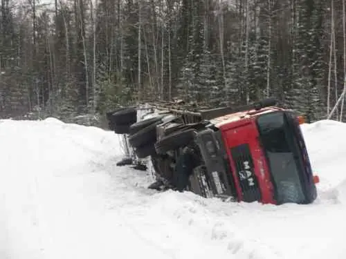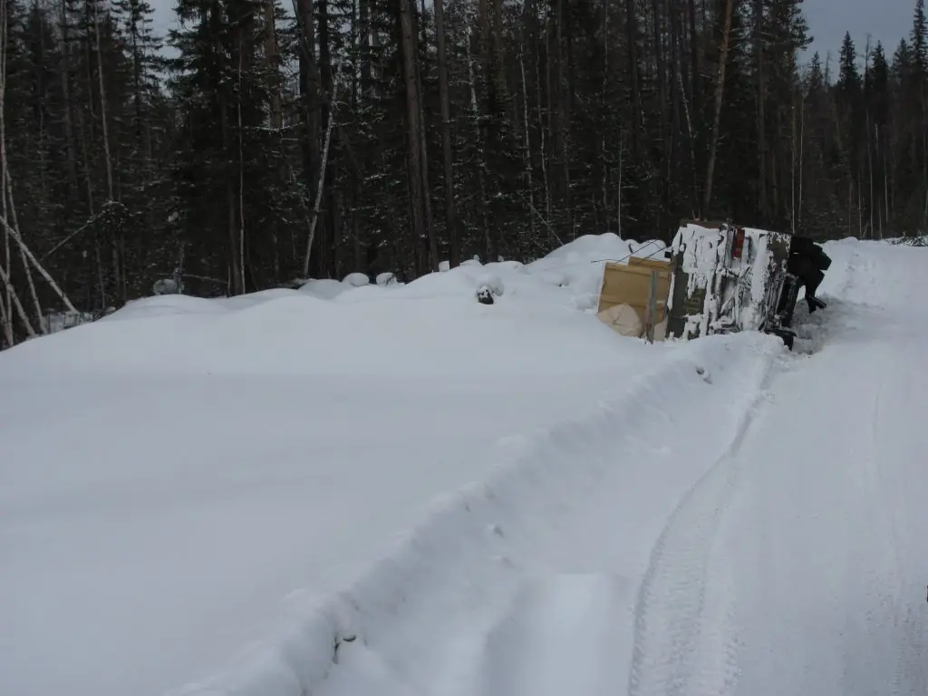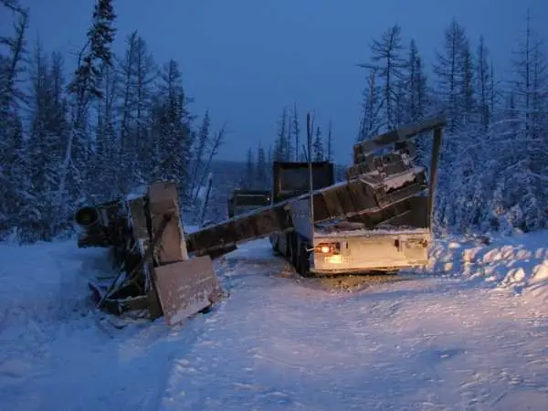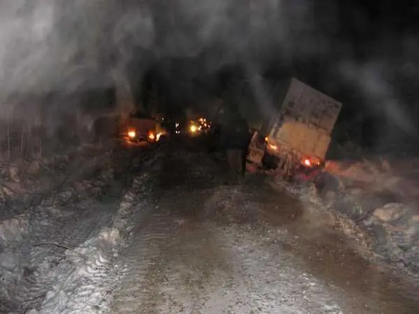 И снова жалею, что меня там не было. Сколько хороших снимков не сделано. Из-за болезни не заехала к ребятам в порту, там обещали сбросить на флешку редкие и качественные снимки, чтобы показать вам. Показываю, что сфотографировала сама. Здесь даже нет и десяти процентов всех ДТП, которые были в дороге. Почти не снимала ночью: мало рейсов, ремонтировались, а в это время жизнь на зимнике бурлила. ЧП снимала с разрешения водителей, не возражали. Только один раз обозленный и измученный водитель запретил снимать, сказал «…вам хихоньки и хахоньки, а мы тут…». Его можно понять, т.к. за годы путешествия бывало всякое, пропустили через собственную шкуру. Другой водитель просил сфотографировать, но не на фоне его машины. Говорит: «… не надо снимать машину. Домашние и так после ваших рассказов волнуются. А тут я лежу на боку». Мои рассказы о зимнике прочитали многие дальнобойщики. Благодарили. Дарили плитки шоколада в дороге и на пикетах. Просили вместе сфотографироваться: «…Жена не поверит, что я вас встретил». Обещали «накатить» за мое здоровье по 100 грамм. Очень надеюсь! Некоторые, прочитав рассказы, заставляли прочитать и своих детей — «Пусть знают почем фунт лиха и с каким трудом отец зарабатывает деньги!». Они правы, работа на зимнике тяжела, а в некоторых случаях опасна. Когда начала писать этот, последний рассказ, муж просил больше не писать о нас с ним. Пробовала, не получилось. Через свое видение, переживание я передаю все то, что приходится испытывать и другим. Может немного по-женски. Но по фотографиям вы поймете, какова жизнь и работа на зимнике. По ВАШЕЙ просьбе почти все фото сопровождаю комментариями.