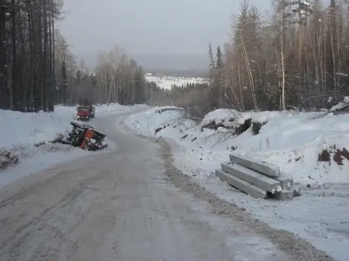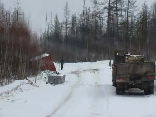 Якутия. Дорога на трассу Мирный—Ленск от Таас-Юрях. На фото не видно, но впереди за небольшой речкой очень крутой подъем. Мост через речушку начали строить давно, наверное, еще в 90-е годы. Так и не достроили. За все это время произошло множество ДТП и даже кому-то уже поставили памятник. Вот и сейчас на объездной уронили контейнер. Водитель уехал за помощью, напарник остался у груза.