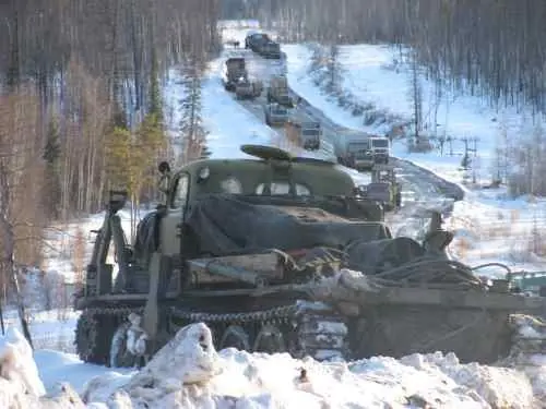 Второй месяц морозы за 40 и 50. Машины часто ломаются, то там, то здесь горят костры, ремонтируются.