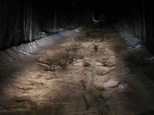 Спуск. Фото для наглядности. Под припорошенным снегом сплошной лед. Черные полосы — следы торможения.