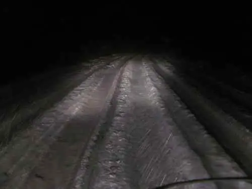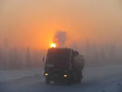 Фотографии зимника. Прошу за качество не судить, т.к. «работал» не профессионал. Большая часть фото сделаны через двойное лобовое стекло (зимний вариант) из кабины по ходу движения, из-за чего фон голубоватый. Фотоаппарат долго «думает». Пока сфокусируется на каком-то кадре — проехали. Чтобы сделать ночные снимки нужно останавливаться, как это видно по фото, где машина загружается нефтью, а в стороне горит газ.