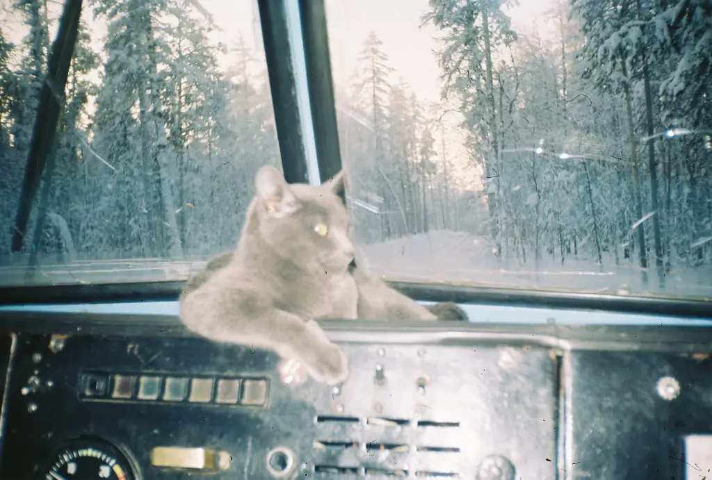 В 12 километрах от Мирного в п. Березовка в кабину пробрался белый котенок. Оставили. Умничка и чистюля, и зимой и летом бегала на улицу. Возвращалась через крышу кабины, растопырив лапки, со скрипом сползала по лобовому стеклу и подходила к одной из дверей. Год с нами путешествовала, скрашивая нам жизнь. На «транзитках», где много транспорта, не путала машину. Однажды после бани на пикете муж взял пиво, спали они в спальном мешке, укрытые с головой. Наша Гайка от похмелья не вставала два дня. Муж смеялся: « А ты думаешь, мы пьем — мы мучаемся!». Гайке уже восемь лет, больше не путешествует, живет дома.