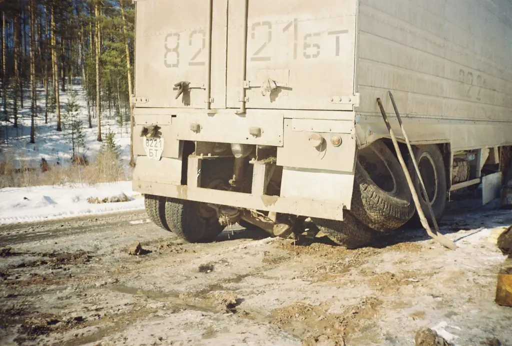 Весна. Выбросило из колеи. На вид почти не гружен, но фактически у него тонн 18. Ремонтировался с нами в Ленске, ушел в рейс совершенно «здоровенький»