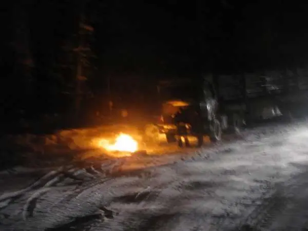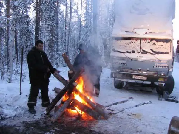Обогнала машина, метров через 100 габаритные огни растворились в дыму. Перед выходом из дымного и лесного коридора в кармашке стоит машина, горит костер. Полным ходом идет ремонт. Хорошо водитель с напарником. Иногда, когда долго ремонтируются, подкидываем продукты, отливаем солярку или делимся запчастями. Бывает, что запасы, которые брали с собой, заканчиваются. В этом году не повезло и нам, подвел двигатель. Почти после каждого рейса ремонт. Жалко мужа. Где ломаемся там и стоим. И к нам подходили, спрашивая, не нужна ли помощь, есть ли продукты?