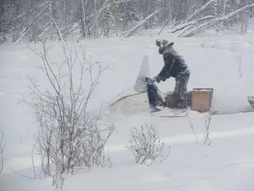 Пошли и мы. Не знаю, какая под нами глубина, но уже через каких-то полтора-два месяца, здесь на Север пойдут сухогрузы и баржи. Остается брать видеокамеру и снимать. Вот и берег. Какое счастье вновь оказаться на твердой почве. Через несколько дней нам здесь возвращаться. Бр-р-р! Как говорится — я не трус, но я боюсь. Почти нет встречных, к вечеру вышли на трубопровод. Переночевали. Утро, подморозило. Идем медленно, дорога вдоль нефтепровода очень плохая — дробь колес по стиральной доске. Идем не больше 10 км/час. Очень крутые подъемы, стало тепло, проскочить подсохшие подъемы не успели. Пошел снег, гололед. Полная мерзопакость! Опасаемся за груз, случись что — не рассчитаться.