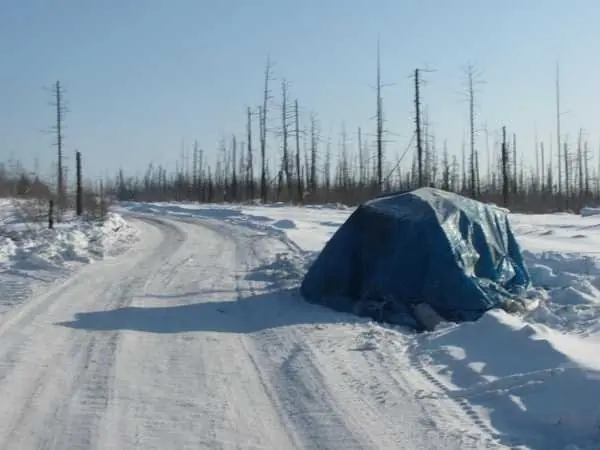 Проходим мимо летних построек. Рядом с машинами в 150 километрах от начала зимника жили водители. Не смогли проехать до пикета Ужман и не вырвались назад весной 2011 года. Летом, когда высох грейдер, вернулись домой. Весной и в начале лета в самое слякотное время. Красная глина делается, как раскисшее мыло. Повезет, если не будет дождей. Вообще в прошлый зимник осталось много машин. Наши знакомые не вышли с зимней дороги на Оленек. Забирать машины поехали только в январе 2012 г. Говорят, многие были разграблены.