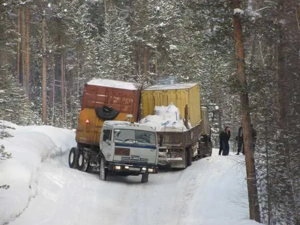 Такое на зимнике происходит часто. На покатых участках дороги, особенно весной, разъезжаться опасно, машины то и дело сползают друг на друга. Однажды мы сцепились стойками. Отцеплялись минут тридцать.