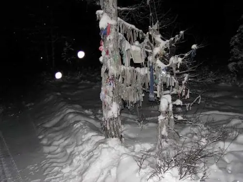 Ленский район. На это дерево повесили много тряпочек и лент. Так делают почти все водители. Бросают монеты, вешают тряпочки, ставят бутылки с горячительным, кидают сигареты. Традиция. Но как-то странно, за многие годы лоскутков не стало больше, или меньше. Проезжая ночью попросила мужа «Подожди, сфотографирую местного духа». Посмеялись, и вот он…симпатичный малый с красным носиком. Даже не ожидала. У кого есть фантазия, увидят.