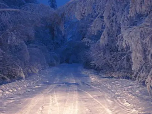 Эта та гора, с которой ночью спускалась колонна машин, в т.ч. мы. Далеко впереди еле заметен подъем на гору с нецензурным названием. Фотография сделана уже почти внизу (не нашла сразу фотокамеру). На фото первая машина стоит, не взяла подъем. Гололед.