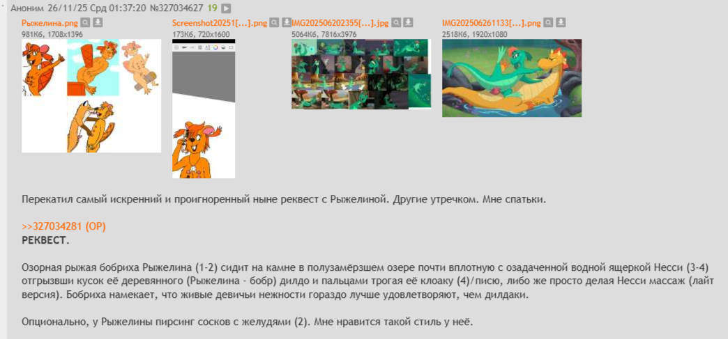 Водная ящерка Несси (1-2) из короткометражки Disney с шапкой и майкой морячки (3) прослезившись сидит иль лежит в объятиях своего друга, МакКряка (4) в виде мощного антро утиного самца с клювом и глядит ему в глаза. У Несси видна клоака (2) с целью подчеркнуть страсть, даже если секса нет.