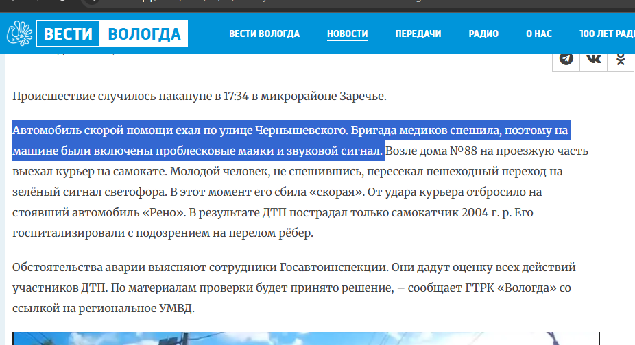 >>327759017 Читай, там где про главные и второстепенные дороги написано. Что виноват в дтп тот, кто выехал с второстепенной дороги и не уступил, да, но если ты видел, что он так делает и ничего не сделал для предотвращения дтп, не нажал на тормоз, хотя мог спокойно затормозить и не врезаться в него, то виноват будешь ты.