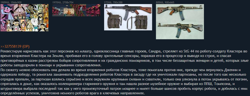 >>327730083 (OP) Перекатить что ли с прошлого. Странно что данная идейка осталась не нарисованной никаким скиллоусом. Меня ещё в прошлый раз надули и прокатили, нейронку подсунув, которая палилась сразу по тому что не нарисовала из шорты у неё, забывать деталь одежды может только нейронка, да и сама она не особо похожа, только в очень общих чертах. Думал, может традишка кун заинтересуется нарисовать, обратив внимание а что-то как-то не случилося. Если понадобятся более подробные описания сцены могу обмозговать да придумать, а так я думал о том что она выскакивает, с гневным решительным выражением лица, зрелищно стреляя по солдату с бластером, а другой жукоподобный робот ну которые помельче, в это время командует расстрелом сопротивления и мирных жителей, поставленных у стенки, ошарашенно смотри.
