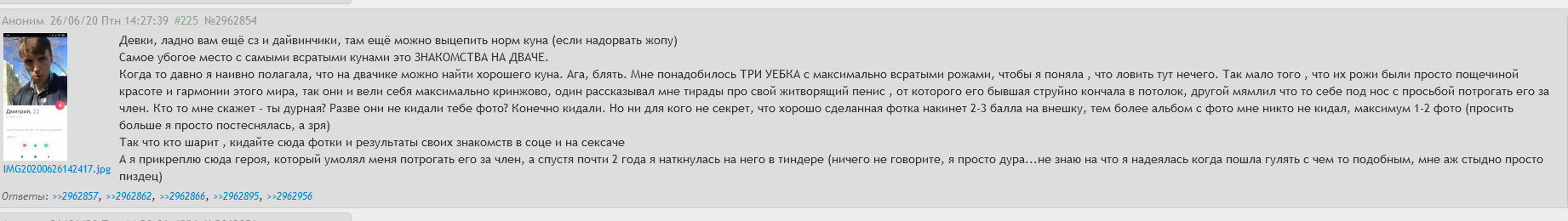 >207 КАРЛ А теперь пойди дальше и попробуй вдумчиво пообщаться с этими персонажами. Прям вот пообщаться, отвечай на их сообщения, задавай им вопросики. Половина отсеится просто на том, что нихуя не напишут после твоего "привет как дела". Остальные покажут себя долбоебами уже в первых сообщениях, потому что начнут писать хуйню про дашь писку лизат. Из этих 200 человек - условных нормисов: неженатых, социально приемлемых, умеющих в переписку, готовых встретиться через неделю общения будет буквально пара человек. А что они будут представлять из себя ИРЛ - уже другой вопрос.