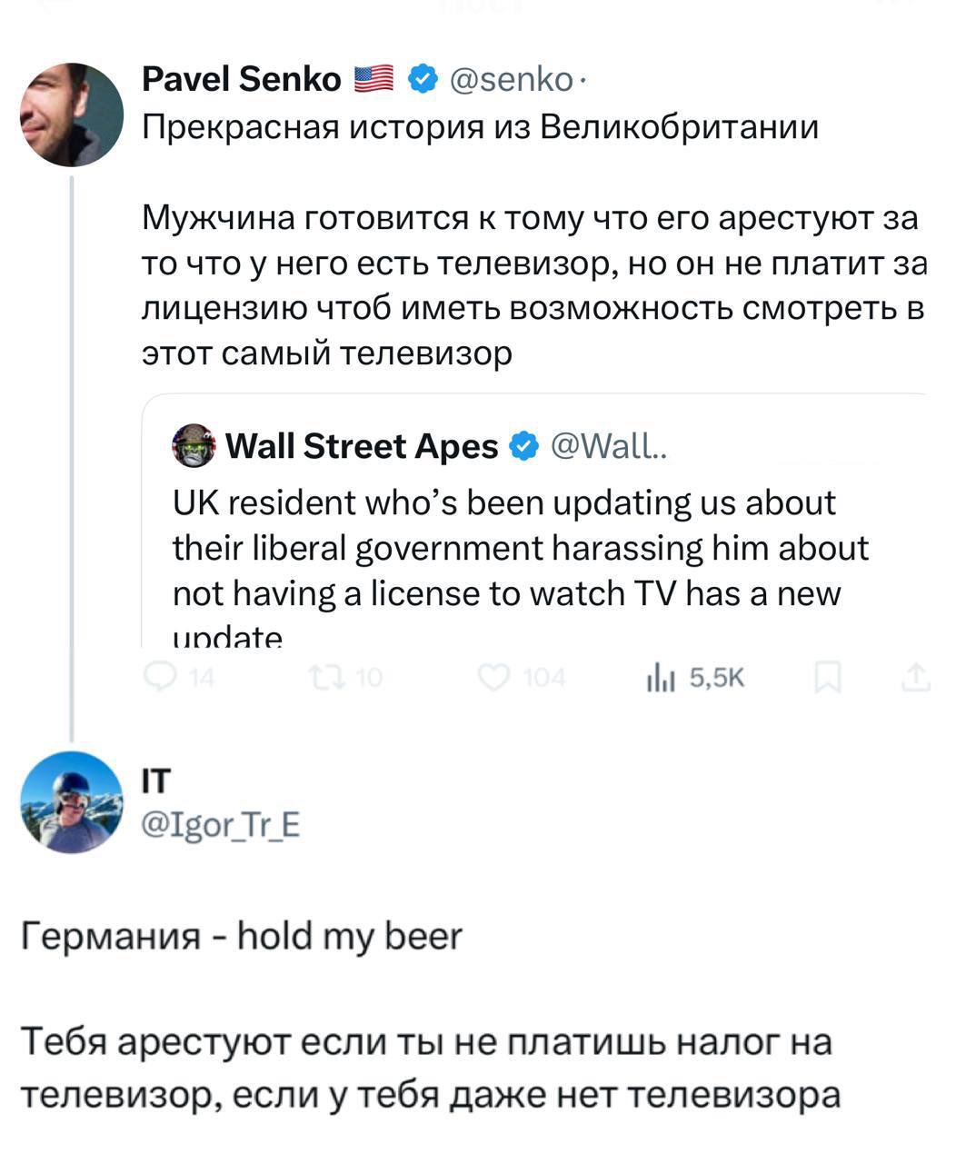 >>327809892 (OP) Ммм, как в Великой Германии налог на телевизор. Только в рф ща молодёжь не смотрит телевизор, а вот телефон есть у всех и выключить точечно его проще чем телевизор. Мировая практика.