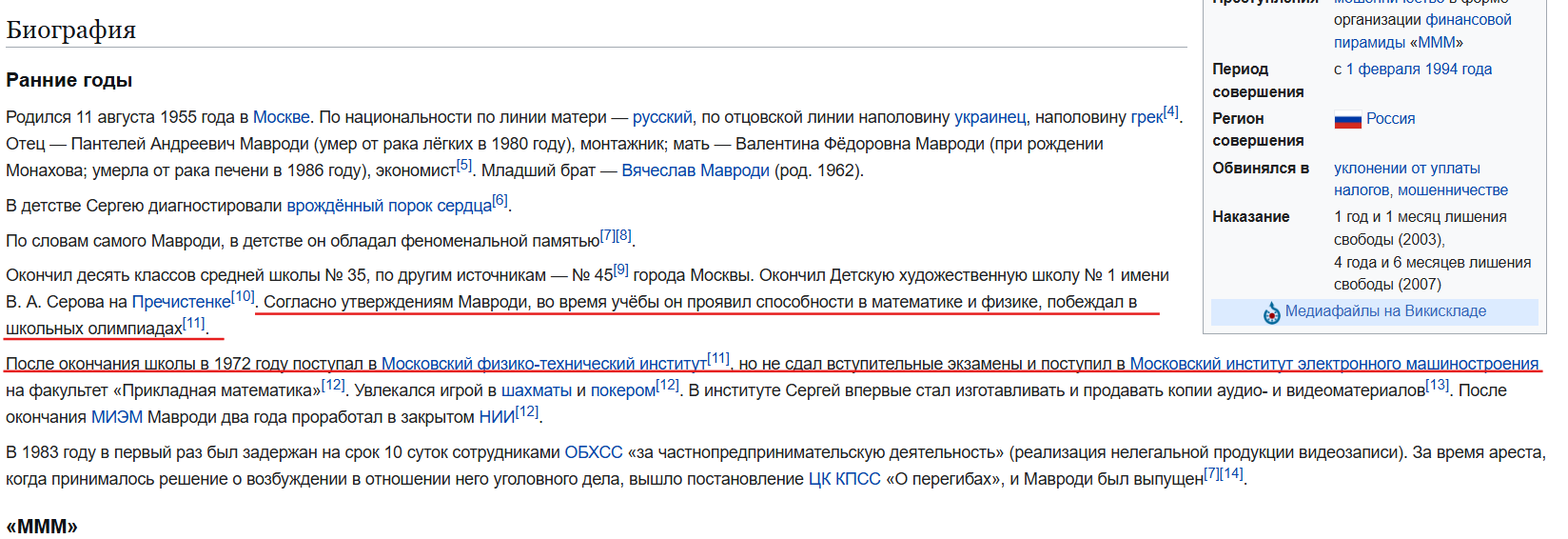Мавроди мог поступить преспокойно, все задачи решил великолепно. Экзамены он сдавал привилегированно кстати, не как у всех, ибо во всех олимпиадах побеждал. НО допустил арифметическую ошибку в одной задаче, ему поставили 3 и он, хоть и мог на общих основаниях поступить, но разочаровался в науке и физике и забил хуй на все. В универе все лекции прогуливал и тд и тп. Все это с его слов, естественно
