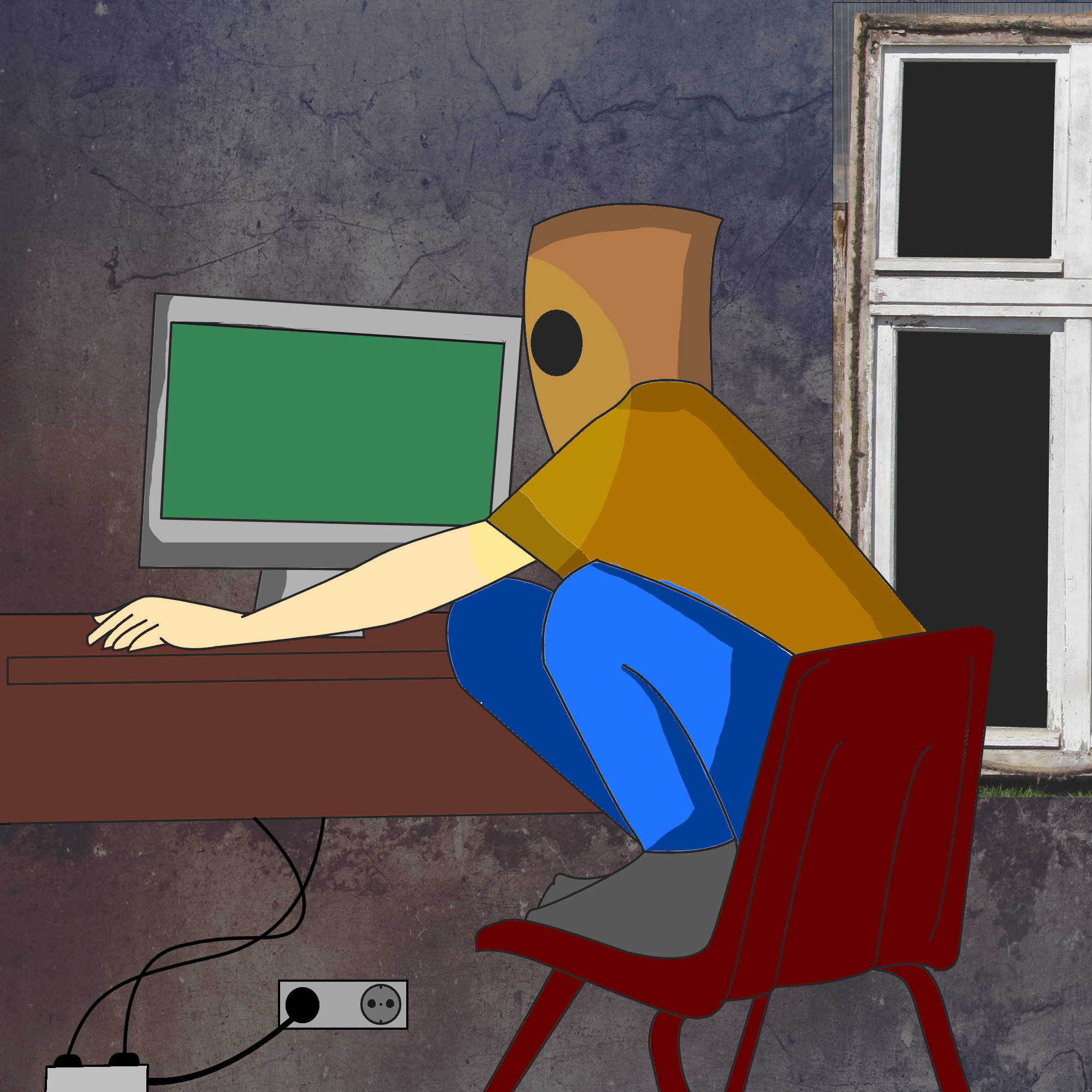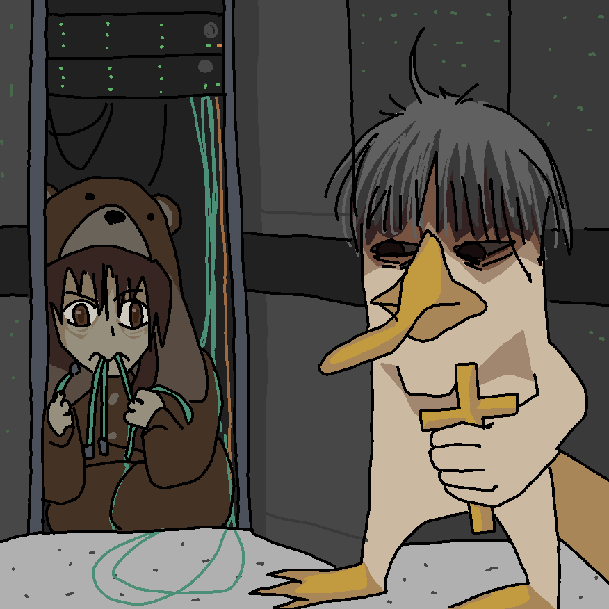 Удивлённый Тэрри открывает серверную стойку, а там сидит Лэйн и хомячит провода ртом (внутри всё разъёбано и переоборудовано под сычевальню расчитанную на одну микродевочку)
