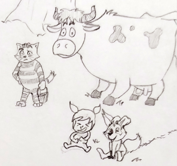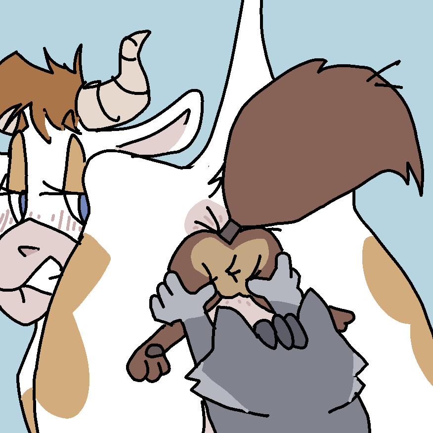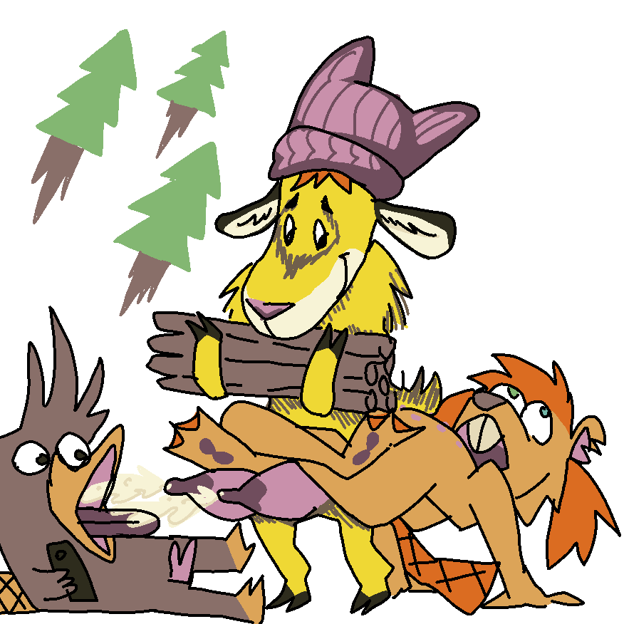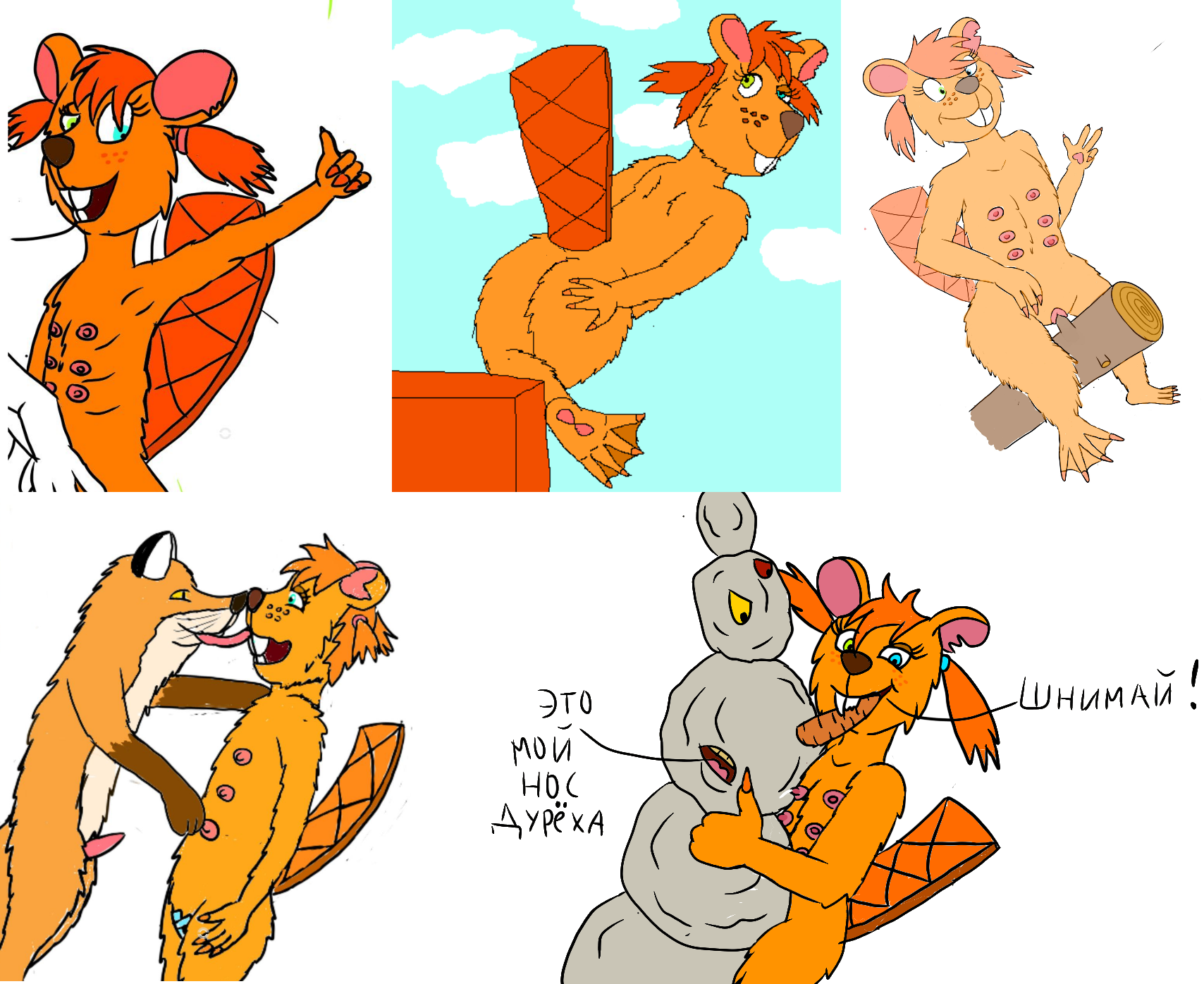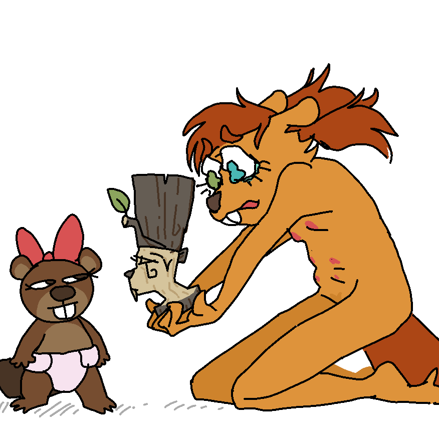 Рыжая Бобриха Рыжелина (1), до слёз радостная, настолько крепко обняла усталую Козу-Дерезу (2-3) с зимними шапкой и шарфом в области бёдер и вымени (3) за принесённые дрова для грызения, что молоко козы брызнуло в Корри Утконоса (4, я в виде утконоса), который с вожделением снимает это на телефон.