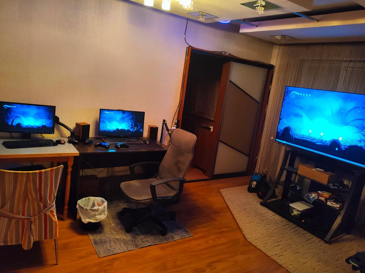 Сычевален тред пятничный Сап, обустраиваю сычевальню. Живу в состоянии ремонта пока. Думал сделать стол вдоль окна пик 1-2. Но столешки такой длинной не было. Сделал пока так, а потом продлевать до стены справа, но слишком много препятствий, во первых мешается комп под ногами, во вторых моник стоит так, что если открываю окно, окно проходит в 5 мм от него. В третьих радиатор не очень хотелось бы перекрывать. Мыть окна - нужно лезть на стол. И тут я подумал, а что если просто стол повернуть так (пик 3.) А у стены напротив поставить пару тумб с ящиками, и полки. Над пекой тоже можно сделать полку, поставить на них колонки. Какой вариант ламповее? Как бы вы обставили комнату?