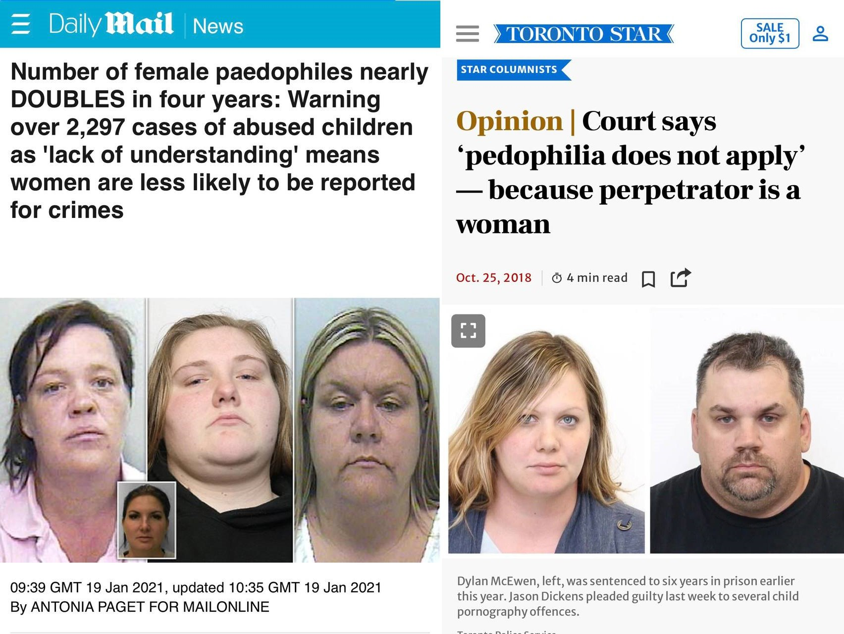 Рэмси-Клаусник (1990) обнаружил, что из 83 детей, подвергшихся сексуальному насилию со стороны женщины, только одна преступница была привлечена к уголовной ответственности. Женщин не привлекали к ответственности, несмотря на то, что факт насилия был подтверждён диагностической оценкой и зачастую носил садистский характер. В 56 % случаев насилие включало в себя прижигание, избиение, укусы или щипки за грудь или гениталии, а также связывание детей во время сексуального насилия. Денов (2001) обнаружил, что отрицание того, что женщины могут быть потенциальными сексуальными агрессорами, является неотъемлемой частью понимания того, как полиция и психиатры относятся к сексуальным преступлениям, совершённым женщинами. Поскольку сексуальные преступления, совершённые женщинами, противоречат традиционным сексуальным сценариям, касающимся «правильного» женского поведения, обе профессиональные группы, сознательно или бессознательно, трансформировали образы женщин, совершивших сексуальные преступления, и самих преступлений, приводя их в соответствие с более приемлемыми в культурном плане представлениями о женском поведении. В конечном счёте это привело к отрицанию проблемы.