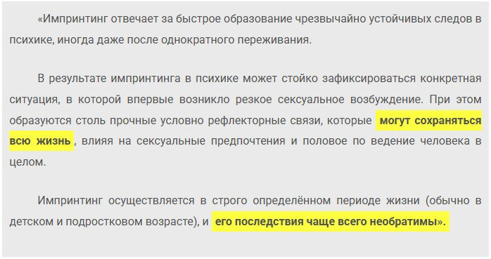 Тем же, кто завидует осквернённым мальчикам, тем хочется напомнить о такой штуке, как половой импринтинг (https://www.sobaka.ru/nsk/health/psychology/181262) (скрин 5). Почитайте. (https://psychologos.ru/articles/view/polovoe-zapechatlenie) Возможно, образумитесь хоть немного. Подобное деяние не может пройти бесследно для психики. Тем более в 12 лет. Вырастит очередной перверт с кучей психических девиаций или какой-нибудь замкнутый асексуал. Знаете, если взрослая женщина 22 лет видит что-то сексуальное в пацане 12 лет, у которого толком голос не сломался, фазы роста не закрыты и ему ещё расти и расти, то с ней явно что-то не так. Как и в случае с такими же мужчинами – любителями сильно помладше.