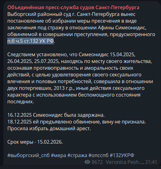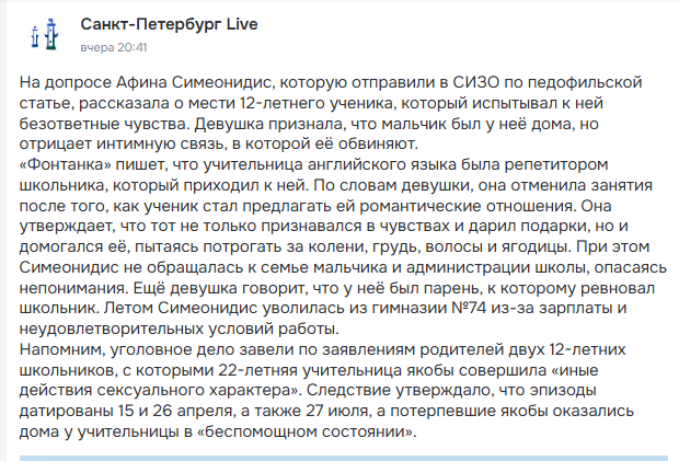 Честно, чет мутная эта симеонидис. Вот явно подвох есть. Ну комон, типа реально СИЗО за то что мальчик сказал чет? Я не верю. Может правда пруфы есть какие?