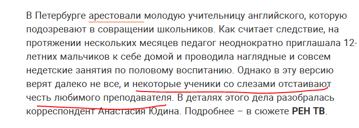 Почитайте интервью Рент ТВ, которые пообщались с семьей потерпевших. Мать парнишки виляет жопой строит из себя ничего не знающую мамашу, ей якобы жаль учительницу, и ее сын очень переживает, ухахаххаха. Ложь, лицемерие и безнаказанность