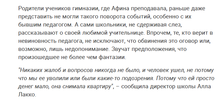 Первый учебный год девушки... Мечта её жизни, по всей видимости, учителем реально идут те, кому это нравится, работа нихуя не благодарная. И новый год она будет отмечать в сизо... Если бы я мог, я бы уничтожил всех виновных, всю систему, что перед Афиной извинились все шлюхи мамашки, которые на неё пожаловались. Заметьте, от них никаких пруфов не было, все каналы на всю страну написали "ПЕДОФИЛКА" и прикрепили её имя, фамилию и личные фото. Человеку жизнь нахуя ломать-то? Это кому она дорогу перешла?