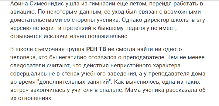 Афина не педофилка, вина не доказана. "Учительница отрицает вину. Симеонидис утверждает, что ее оговорил один из учеников, который влюбился в нее, но она не ответила взаимностью. На суде педагог просила для себя заключение под домашний арест."