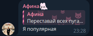 Появился следующий интересный персонаж, с которым Афина что то перетерала. Вот ща стало чуть задорнее, интересно, интересно. Ладно может просто мимо хуй какой то. Чёт какой то опрос просто, ну ради опроса до не будет никто так в залупу лесть то лел)
