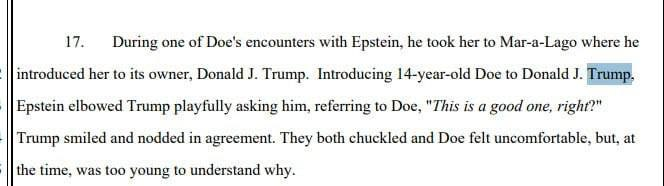 >Эпштейн привёл 14-летнюю девушку к Трампу в Мар-а-Лаго, сказав: «Это хорошая девушка, правда?» – Трамп кивнул в знак согласия — указано в рассекреченных документах по делу Эпштейна.