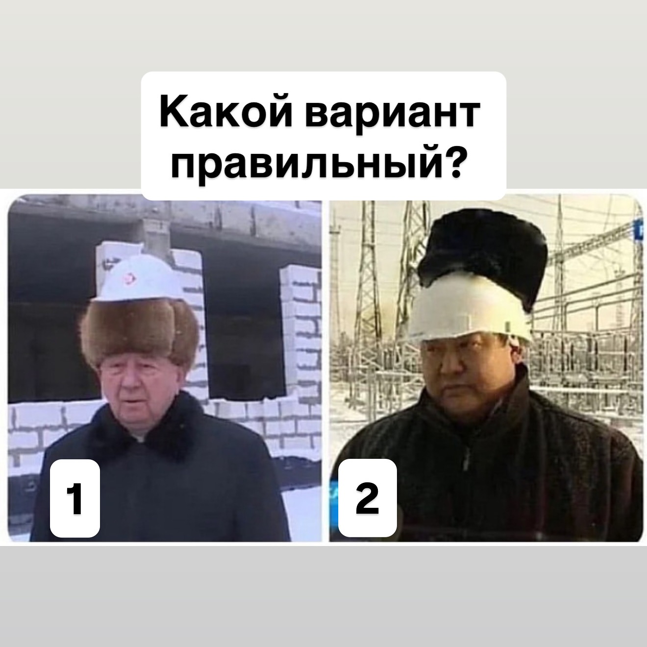 Тут интересно, этнический фактор. Слева - начальник или русский или еврей, может быть - хохол. Ну так вот - в первом случае начальник, конечно, хладоустойчивый, "но не совсем" - ушки на морозе открытые, но голова, всё равно, покрыта начальской шапкой, статусной, "как у дидов", а потом уже идет вопрос безопасности и показателя того, что начальник на объекте, работает - каска.