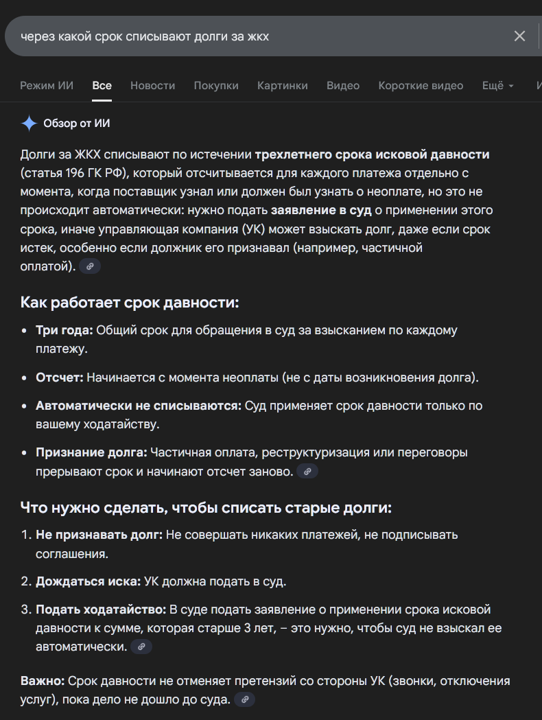 >>327831232 Спросил иишку. Если жилье в собств (не ипотека и не мун жилье) и единственное, то отобрать не могут. Единственный дебаф - запрет на регистрационные действия. Далее вишенка на торте. Срок исковой давности три года. Через три года долг по квартплате сгорает кек. Думаю многие этим пользуются.
