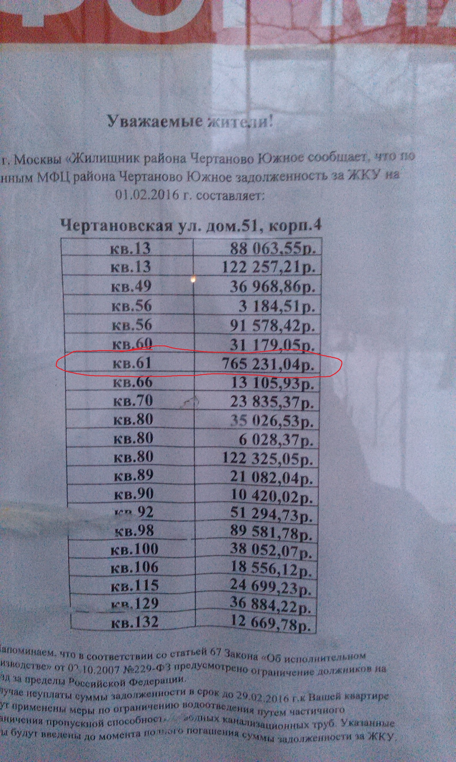 >>327827660 Долг по ЖКХ + долг по кредитке. Коллекторы не беспокоят, но УК заебала со своими списками и наклейками, перед соседями стыдно, пришлось кредиткой гасить задолженность частично >>327827690 наклейку сорвал, тк она на МОЕМ почтовом ящике, а листовку не стал срывать, тк я там не один и она висит под камерой на инфо щите