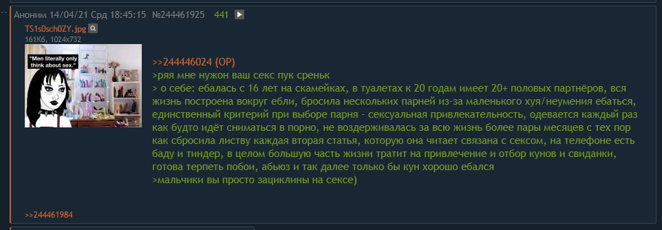 >>327918233 У человека есть тормоза и принципы, у вписочных солевых блядей их в принципе нет, только одни хотелки при беспросветной лени и никчемности. Просто прикидываешь что будет если исследуемому существу стукнет 60 лет, как оно будет жить. Если у тебя ответа нет, то нахуй пусть идет. Еще один тест - что будет делать это существо, если тебе кирпич на голову упадет и ты станешь наполовину овощем. Если вероятнее всего даст по тапкам, то тоже нахуй. С выбором куна та же самая схема, если безмозглая неразборчивая тян проебется, то получит алкаша, который рано или поздно начнет ее пиздить и ходить налево. Мудрость приходит с опытом, главное не быть падким на конфетти и мишуру, не торопиться и смотреть на всё со стороны. >>327918324 >Я не согласен, среднего класса здесь нет. Во первых средний класс это понятие условное, а во вторых я говорил про чистилище между средним классом и нищетой, в котором все застряли, легкое недоедание, стимулирующее на потребление всего что блестит и падкость на всякого рода темки. >>327918366 >А могла ведь на кассе целыми днями сидеть или в каком-нибудь озоне, за гроши. Обычно темщики этим и заканчивают свои приключения - кб, озон, касса в говнерочке/говните, ресепшен какого-нибудь мелкобизнеса по оказанию услуг. Хочешь не нарваться на темщицу - ищи бабу с карьерой (пусть даже и начинающую), им тупол некогда заниматься всякой хуйней. >>327918862 >Женищнам мужчины дали свободу. И как они ей распорядились? Стали поголовно проститутками? В этом для них вся свобода? Нет, в этом свобода только для ленивого быдла с пиздой, нормальные девочки получают образование, выбирают приемлемый для них уровень нищеты, садятся на жопу ровно и живут спокойную порядочную жизнь.