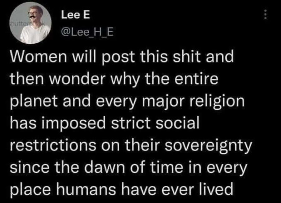 Бабы будут постить подобное дерьмо, а потом удивляться, почему с начала времен вся планета и каждая религия налагала строгие ограничения на их суверенность