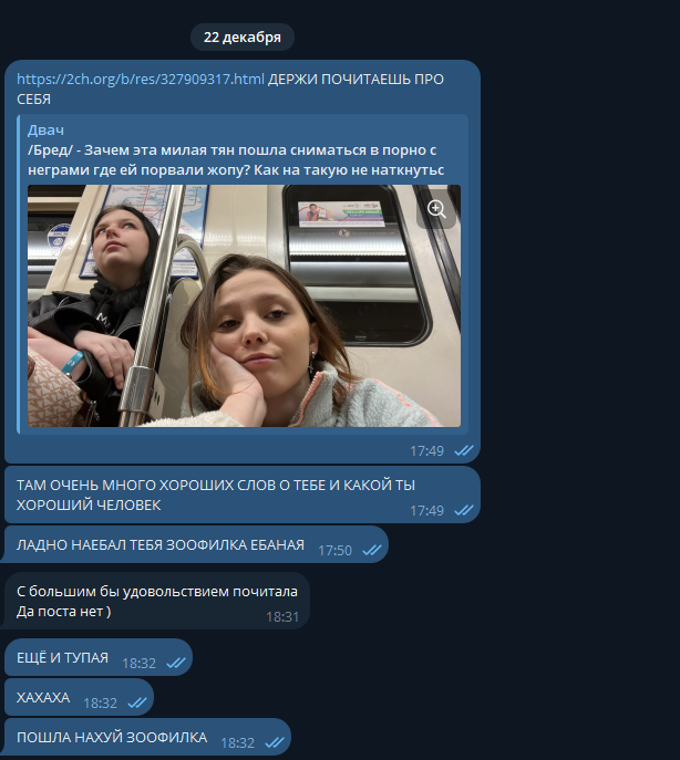 >>327928509 Это не травля. Травля это когда кидают её прошлое всем друзьям/родственникам и клеют объявления её лицом. Это просто тред милой тян, которая стала грязной шлюхой. Написали только ей и всё, не паали даже ебырю и друзьям. Какая это травля? Мы против травли, никто этого не заслуживает