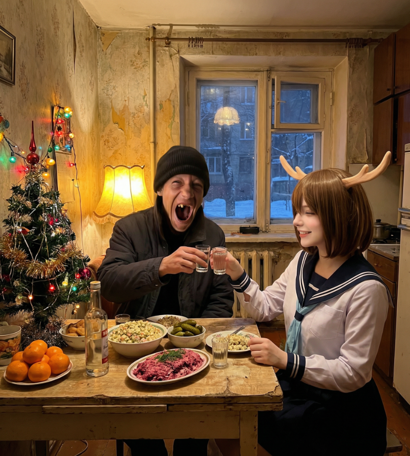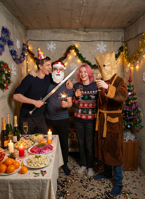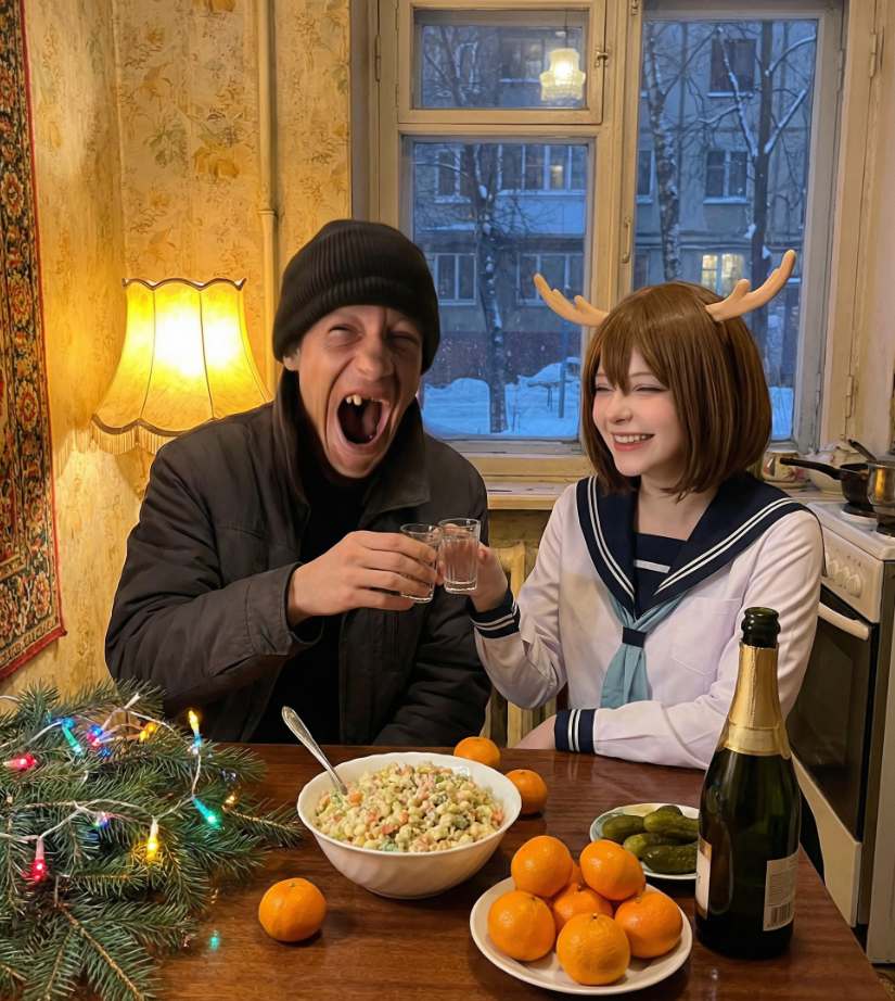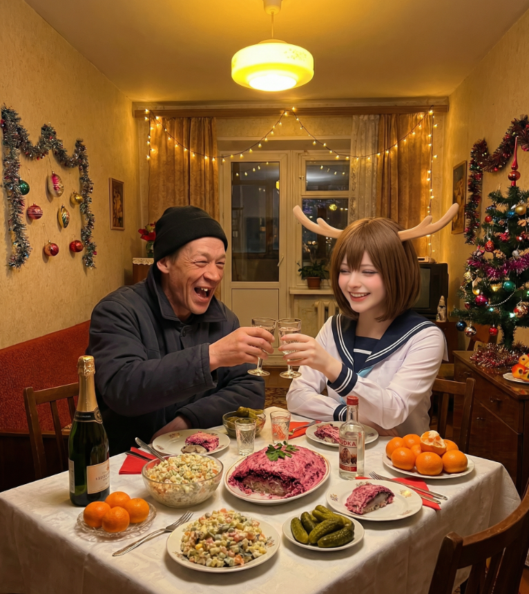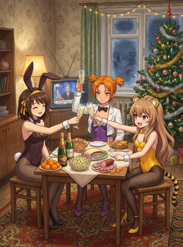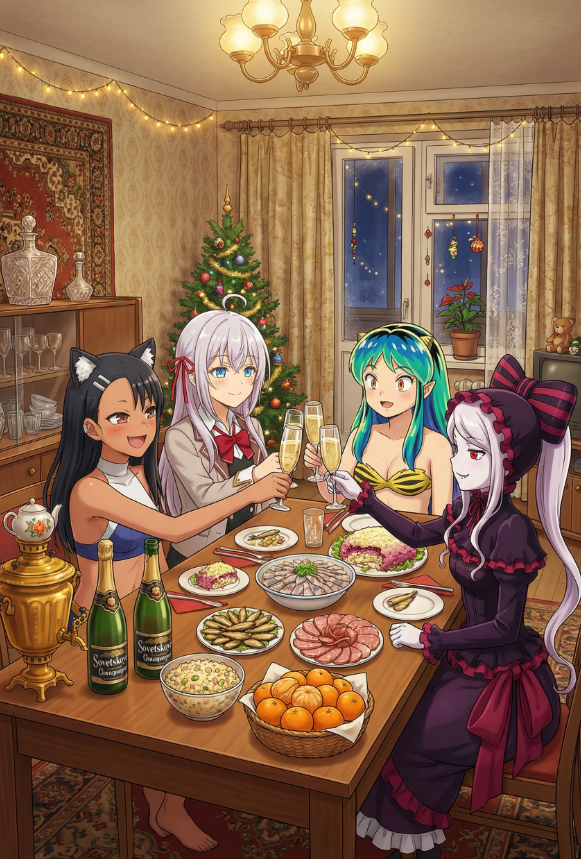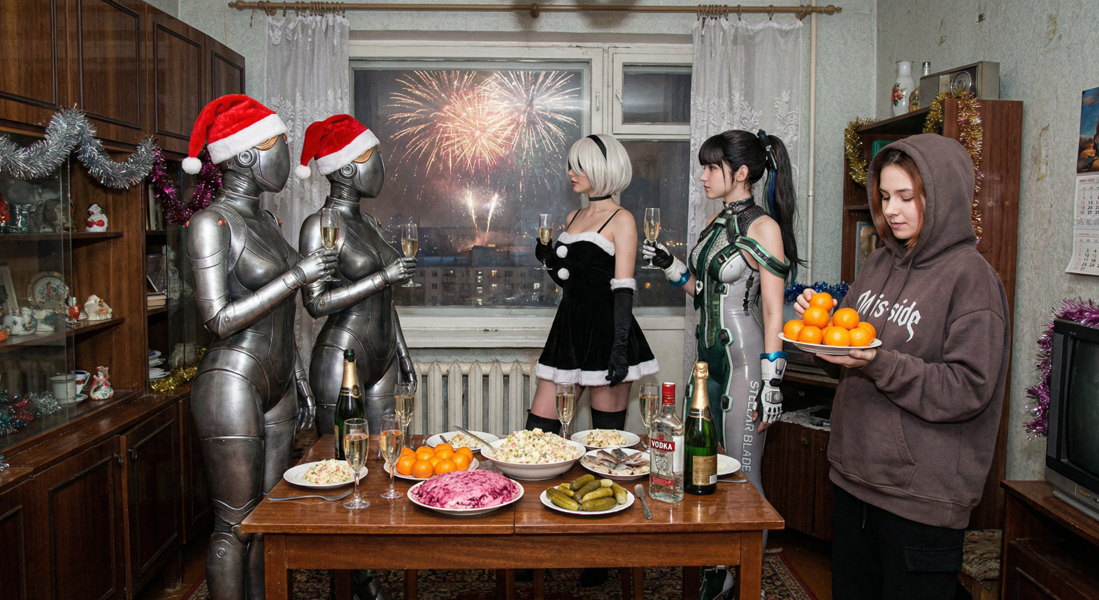 Близняшки-балерины из Atomic Heart с красными новогодними шапками на головах, Yorha 2B в мини-костюме санты, Мита из Мисайд с тарелкой мандаринов в руках и Ева из Stellar Blade сидят за новогодним столом в типичной пост-советской квартире за новогодним столом. На столе множество еды и бутылок с алкоголем. Все кроме Миты держат в руках бокалы с шампанским и смотрят в окно, в окне виден праздничный салют. Все девушки выглядят как реальные люди. Изображение похоже на качественную фотографию со вспышкой.